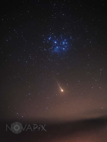Below the Pleiades star cluster is actually a planet: Mercury. Mercury's thin atmosphere contains small amounts of sodium that glow when excited by light from the Sun. Sunlight also liberates these atoms from Mercury's surface and pushes them away. The yellow glow from sodium, in particular, is relatively bright. Pictured, Mercury and its sodium tail are visible in a deep image taken on april 27 2022 from La Palma, Spain through a filter that primarily transmits yellow light emitted by sodium. First predicted in the 1980s, Mercury's tail was first discovered in 2001.