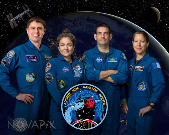 The four members of NASA's SpaceX Crew-12 mission to the International Space Station pose together for an official crew portrait. From left are, Roscosmos cosmonaut and Mission Specialist Andrey Fedyaev, NASA astronauts Jessica Meir and Jack Hathaway, Commander and Pilot respectively, and ESA (European Space Agency) astronaut and Mission Specialist Sophie Adenot (Oct. 17, 2025).